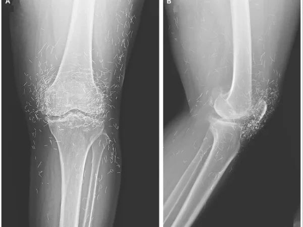 مذکورہ بالا تصویر ایک 65 سالہ خاتون کے گھُٹنے کے ایکسرے کی ہے جس میں دیکھا جا سکتا ہے کہ گھٹنے کے گرد سینکڑوں چھوٹے سونے کے تارموجود ہیں۔